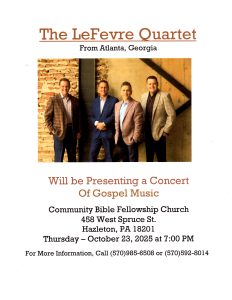 Thursday October 23rd @ 7:00 PM. The Lefevre Quartet is going to make a special appearance. Come join us and we fellowship with some of the best christian music out there.