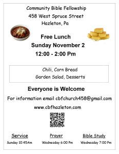 Sunday October 2nd CBF We will be hosting a free community lunch. Everyone is invited and welcome to join us. The lunch will start immediately following Sunday’s service. This meal is held in the church basement.
