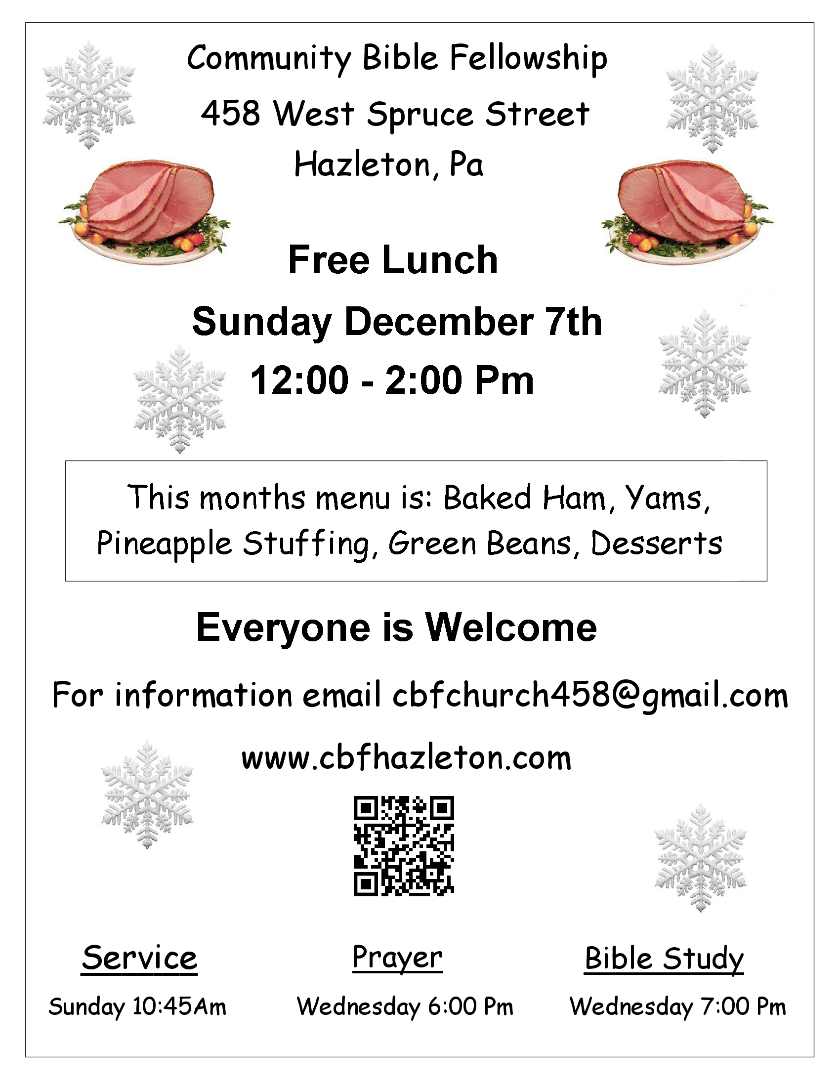 Welcome Community Bible Fellowship For God so loved the world that he gave his only begotten Son, that whosoever believeth in him should not perish, but have everlasting life. John 3:16 Service Times SundayWorship Service 10:45 Am WednesdayPrayer 6:00 Pm Bible Study 7:00 Pm Latest Sermons Below you will find the latest messages. Sunday MorningPastor FrankJesus Amist The Candlesticks Sunday November 30, 2025 https://www.cbfhazleton.com/audio/sunday_service_11_30_2025_pf_jesus_amist_the_candlesticks.mp3 Sunday EveningPastor FrankComing Soon Sunday November 30, 2025https://www.cbfhazleton.com/audio/sunday_service_11_16_2025_pw_gods_wake_up_call_pt2.mp3 WednesdayPastor FrankRomans Lesson 13 (Part 2) Wednesday November 26, 2025https://www.cbfhazleton.com/audio/30-2025_1119-RomansLsn13-Pt2.mp3 More Messages Events At a glance Community LunchSunday, Dec 7 @ 12:00 PM Our Location Community Bible Fellowship458 West Spruce StreetHazleton Pa 18201 Lorem ipsum dolor sit amet, consectetur adipiscing elit. Ut elit tellus, luctus nec ullamcorper mattis, pulvinar dapibus leo. SundayPastor Frank Guest SpeakerThe giedonsSpiritual Gifts Sunday November 16, 2025https://www.cbfhazleton.com/audio/sunday_service_11_16_2025_pw_gods_wake_up_call_pt2.mp3