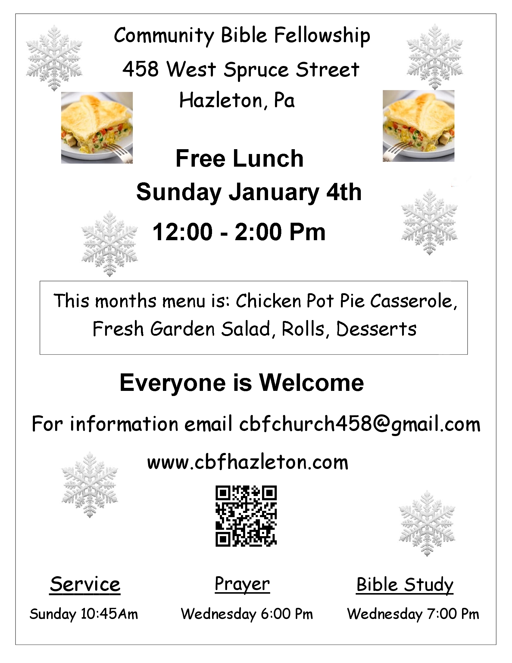 Welcome Community Bible Fellowship For God so loved the world that he gave his only begotten Son, that whosoever believeth in him should not perish, but have everlasting life. John 3:16 Service Times SundayWorship Service 10:45 Am WednesdayPrayer 6:00 Pm Bible Study 7:00 Pm Latest Sermons Below you will find the latest messages. Sunday MorningPastor WallyWalking By Faith Sunday December 28, 2025https://www.cbfhazleton.com/audio/sunday_service_12_28_2025_pw_walking_by_faith.mp3 Christmas Eve ServicePastor Frank Wednesday December 24, 2025https://www.cbfhazleton.com/audio/sunday_service_12_24_2025_pf_christmas_eve_service.mp3 Sunday EveningPastor FrankComing Soon Sunday December 7, 2025https://www.cbfhazleton.com/audio/sunday_service_11_16_2025_pw_gods_wake_up_call_pt2.mp3 More Messages Events At a glance Community LunchSunday, January 4 @ 12:00 PM Our Location Community Bible Fellowship458 West Spruce StreetHazleton Pa 18201 Lorem ipsum dolor sit amet, consectetur adipiscing elit. Ut elit tellus, luctus nec ullamcorper mattis, pulvinar dapibus leo. SundayPastor Frank Guest SpeakerThe giedonsSpiritual Gifts Sunday November 16, 2025https://www.cbfhazleton.com/audio/sunday_service_11_16_2025_pw_gods_wake_up_call_pt2.mp3